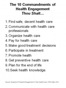 This statement comes out of CFAH’s analysis of 31 surveys gauging how people ‘do’ health that is, the sum of actions individuals take to obtain the greatest benefit from the health care services available to them, or health engagement. The Center identified 10 categories that, together, account for health engagement actions; these are identified as the “10 commandments of health engagement” in the chart, and include seeking knowledge, planning and organizing, communicating, and making good decisions about health.