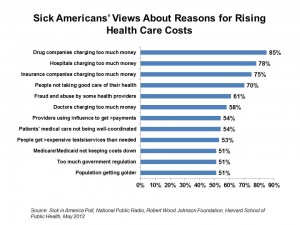 Other cost drivers cited by the sick are fraud and abuse (61%), lack of coordinated care which leads to duplication of tests and treatments (54%), and 51% of people noting population aging, government regulation, and Medicare and Medicaid spending out of control.