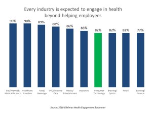 I learned several years ago that people want to engage with many industries for their health, well beyond hospitals, pharma and life sciences companies, and pharmacies. The bar chart, derived from data from the 2010 Edelman Health Engagement Barometer survey, shows that most consumers look to virtually every industry segment to engage in health, including food and brewing/spirits to financial services and, yes, electronics companies (shown in green).
