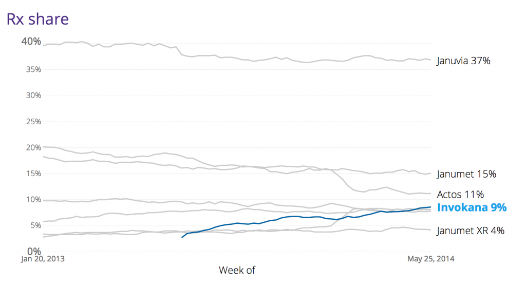 this story, the Insight platform can also look at prescription drug patterns in groups of patients. Chris’s team looked at the pattern of prescribed anti-diabetic drugs in patients with Type 2 Diabetes. The market for anti-diabetic prescription drugs is very competitive; the most popular one is Januvia from Merck. With the introduction of Invokana in March 2013, Januvia took a market share hit, as the third graph illustrates. The data also showed a relationship between physicians prescribing Invokana more among patients who were younger with higher BMI.