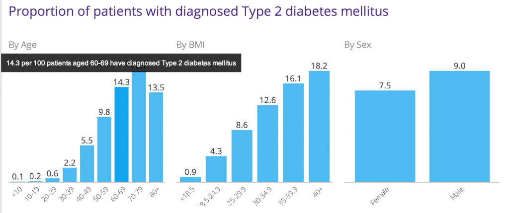 We also looked at Type 2 Diabetes with respect to prescription drug share (that is, which drugs were most prescribed to patients for managing T2 Diabetes). The second chart illustrates the raw truth that as BMI increases, so too does incidence of diabetes, and especially over the age of 35.