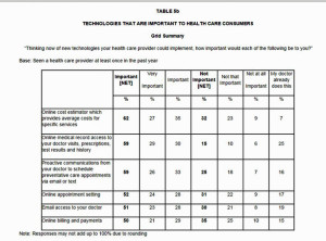 At least one-half of all health care consumers are looking for technologies that help them with administrative and financial aspects of the doctor’s visit. These include online cost estimators which give the patient an idea of the cost for services ahead of time (valued by 62% of people); online medical record access (for 59%), proactive communications from the doctor to schedule preventive care, via email or text (59%); online appointment scheduling (52%); email access with the doctor (51%); and online billing and payments (50%). Again, these tech-demands vary by generation, with majorities of people under 50 looking for all the tools to be available. For the Matures, over 70, the most desired tech tools are access to online medical records and proactive communications from the doctor for preventive reminders.