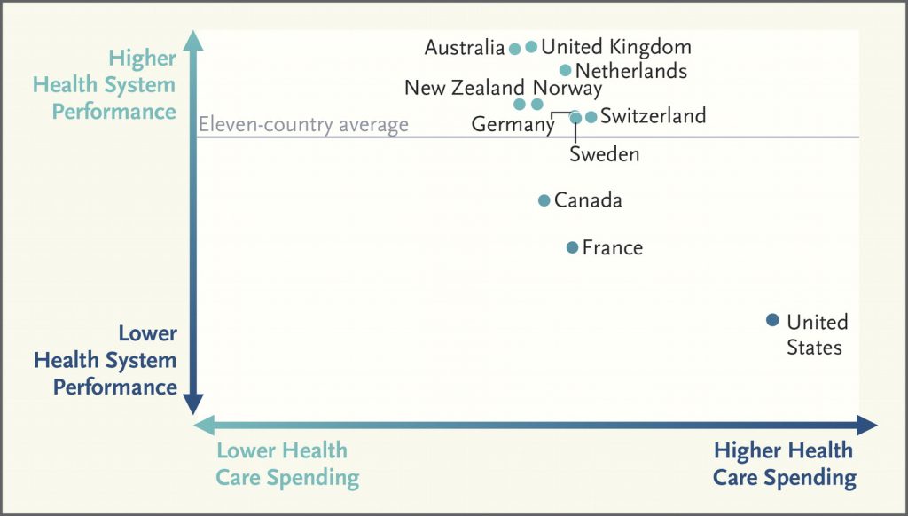 A perspective published last week in The New England Journal of Medicine begs the question, From Last to First — Could the U.S. Health Care System Become the Best in the World? The “Last” in the article’s title refers to reports from The Commonwealth Fund comparing Americans’ health outcomes and national spending to other wealthy countries’ health citizens and systems, where the U.S. fails to achieve their level of results. This low-ranking is shown in the second chart based on OECD data for 2014.