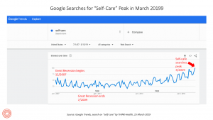 Google trends self-care trends for search pre-Recession to 3-15-19 with milestones