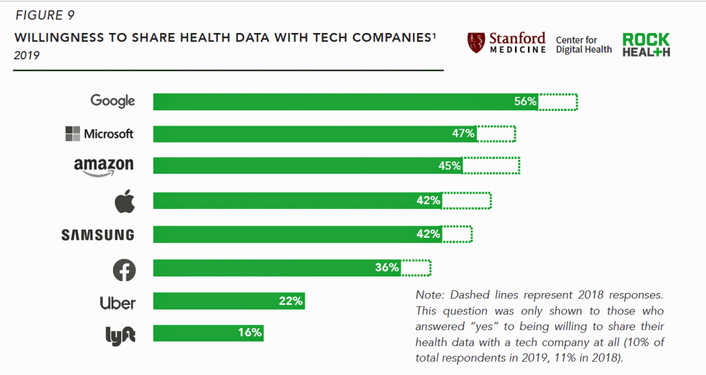 And this year, Rock Health added in Uber and Lyft, with whom 22% and 16% of consumers would share health data, respectively.