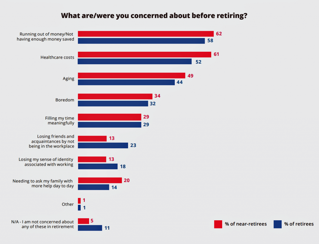The top two concerns for most Americans nearing retirement were “running out of money/insufficient savings” and healthcare costs.