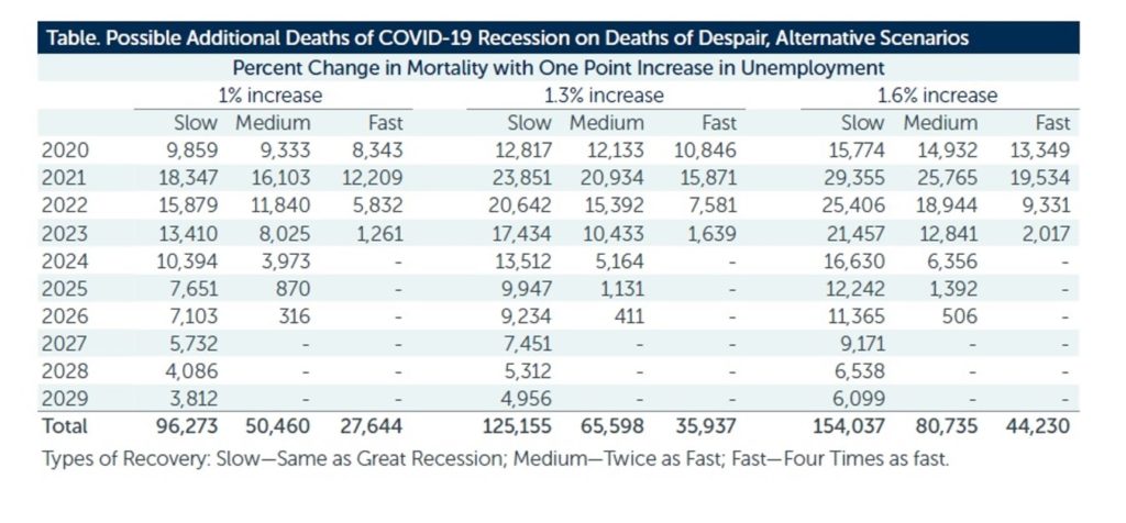 Assuming a 1% increase in mortality with a one point increase in unemployment and a fast economic recovery, some 27,000 Americans would die a death of despair.