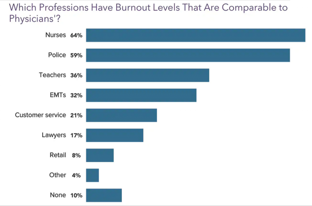 When asked which professions have burnout levels comparable to physicians, doctors pointed first to nurses (64%), followed by police (59%) and then teachers and EMTs (36% and 32%, respectively).