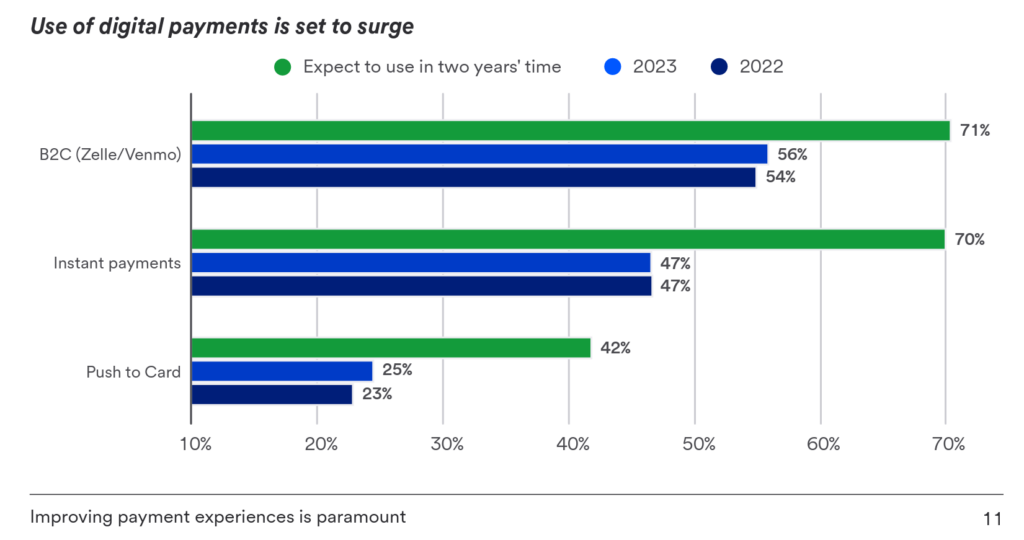 U.S. Bank found that 54% of the organizations polled already use B2C payment methods like Venmo and Zelle — a higher rate than found in other industry sectors in U.S. Banks experience. The chart here illustrates U.S. Bank’s expectation that the “use of digital payments is set to surge” by 2025.