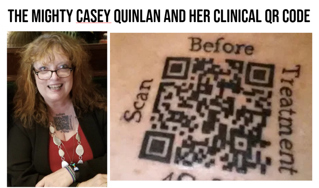 Click on the link above for free access to this tribute, where you’ll learn about the Mighty Casey as a performer, journalist, blogger, podcaster, and activist–and a very active participant in her own care once diagnosed with cancer. The graphic here is of the QR code she had tattooed on her sternum in 2014, embedding much of her electronic health record data. You can read the story of that tattoo and its provenance here.