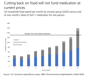 UBS report on the economics of getting thing GLP1s food per month vs GLP spending graph