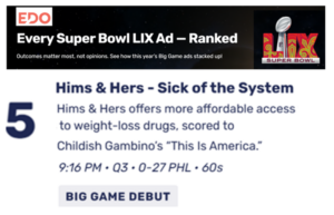 EDO hims and hers engagement SuperBowl LIX ad analysis summary slide
