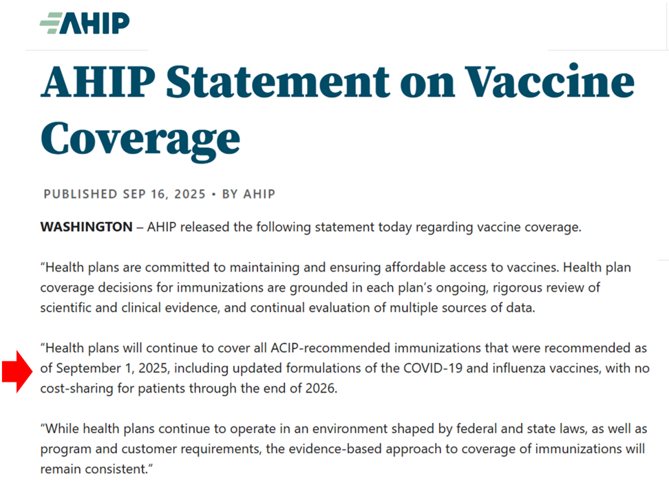 Grateful to AHIP, the health insurance advocacy organization, for issuing this statement of support for vaccines listed on the CDC schedule as of 1 September 2025….”with no cost-sharing for patients through the end of 2026.”