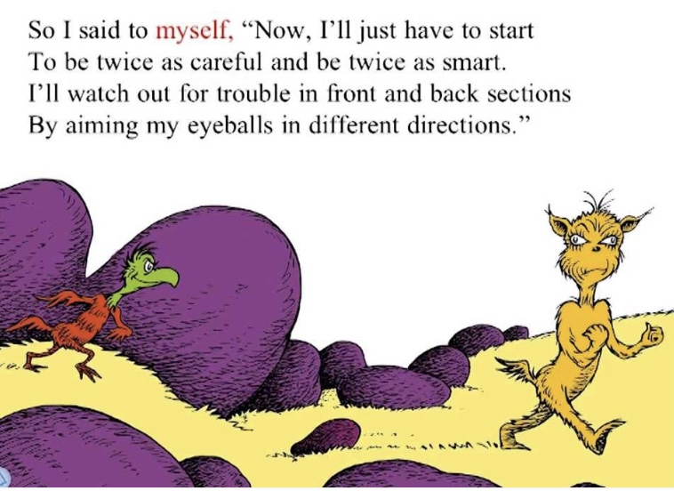 Our protagonist reminds us that “to be twice as careful and twice as smart,” we must “watch out for trouble in front and back sections by aiming” our “eyeballs in different directions.”
