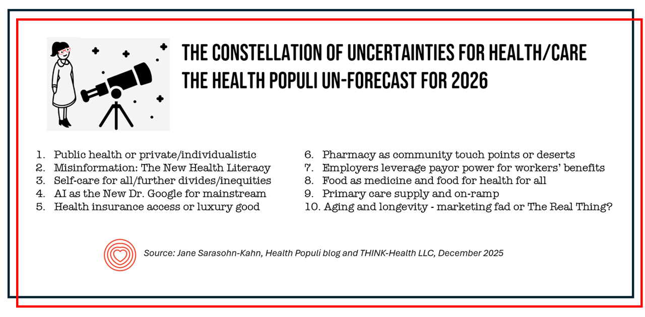 Today I have a full inbox and file on my hard drive of 2026 forecasts, at least three dozen of them, and my intent was to review the best of them and share with you my Top 10 Tea Leaf Reads among them. But I have a better idea, given the State of Our Health/Care World — and my own demands from clients and colleagues for how to consider so many uncertainties accompanying us into 2026.