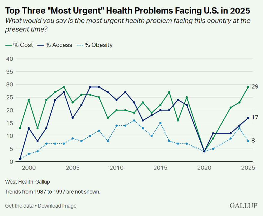 The Gallup Poll and West Health zeroed in on how health care costs fit in the affordability equation for mainstream Americans, shown in the line chart, We see hockey-stick growth in Americans’ perceptions of cost being the most urgent health problem facing the U.S. in 2025m following by increasing concerns for access.