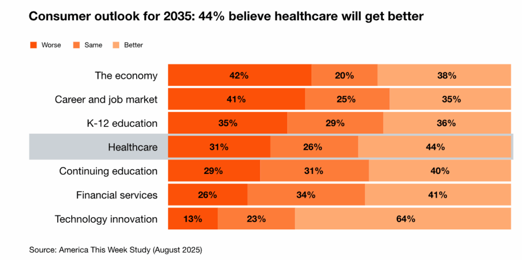It makes sense then to see what underlies the optimism those 44% of U.S. consumers feel about health care improving by 2035 — led by advancements in medical technology (felt by 60% of people) and 54% citing early detection and prevention.