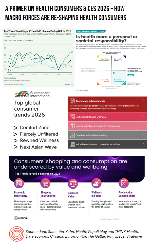 For 2026, the health consumer muscle-building will grow as people will be re-shaped by macro market factors we are currently gleaning from forecasts looking into the new year: for personal finances, social issues, technology adoption, views on AI and privacy, and other issues. Here are some data points to keep in mind for health care planning in 2026, especially relevant for the CES 2026 being held in Las Vegas 6-9th January 2026. I’ll be there for an entire week of meetings and conversations, so now in prep-mode, sharing my pre-conference thoughts with you here on Health Populi. [For my preview on all-things-health/care at #CES2026, here’s your link to learn about our journeys to our personal health operating systems, CES-tech-enabled].