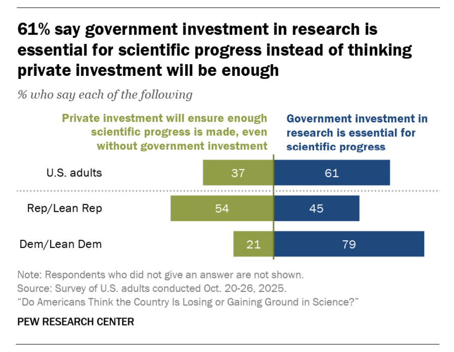 First, note that many more Americans who identify as Democrat or leaning Dem believe that government investment in research is essential for scientific progress.