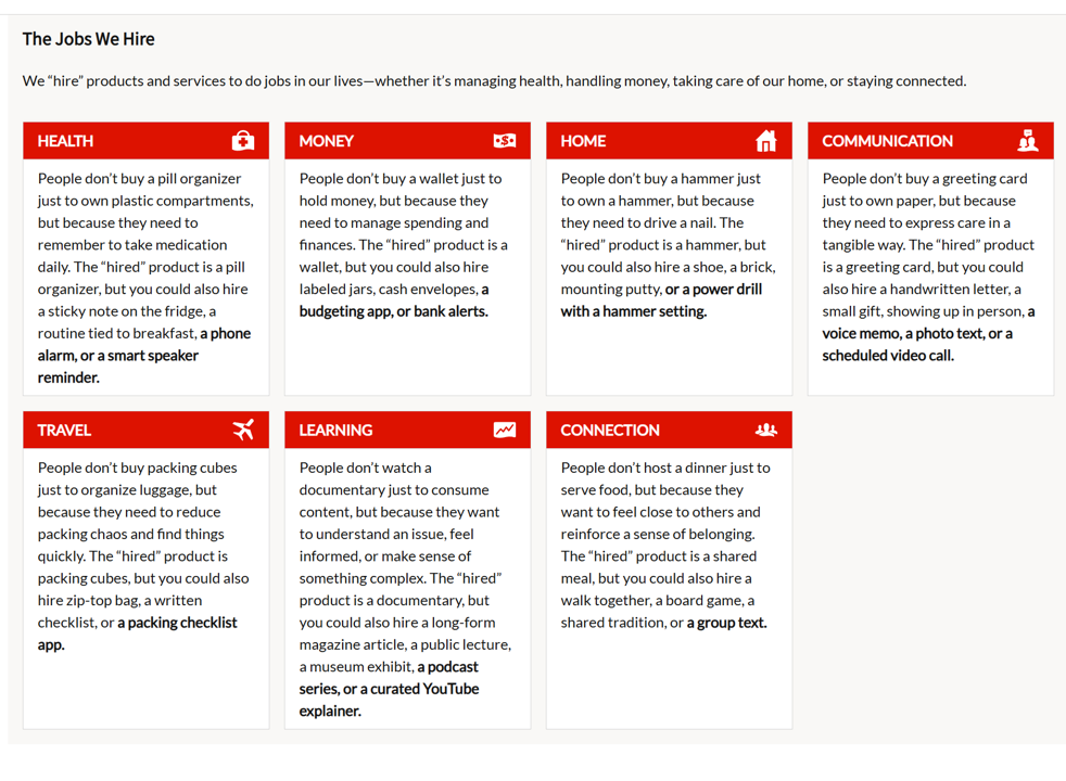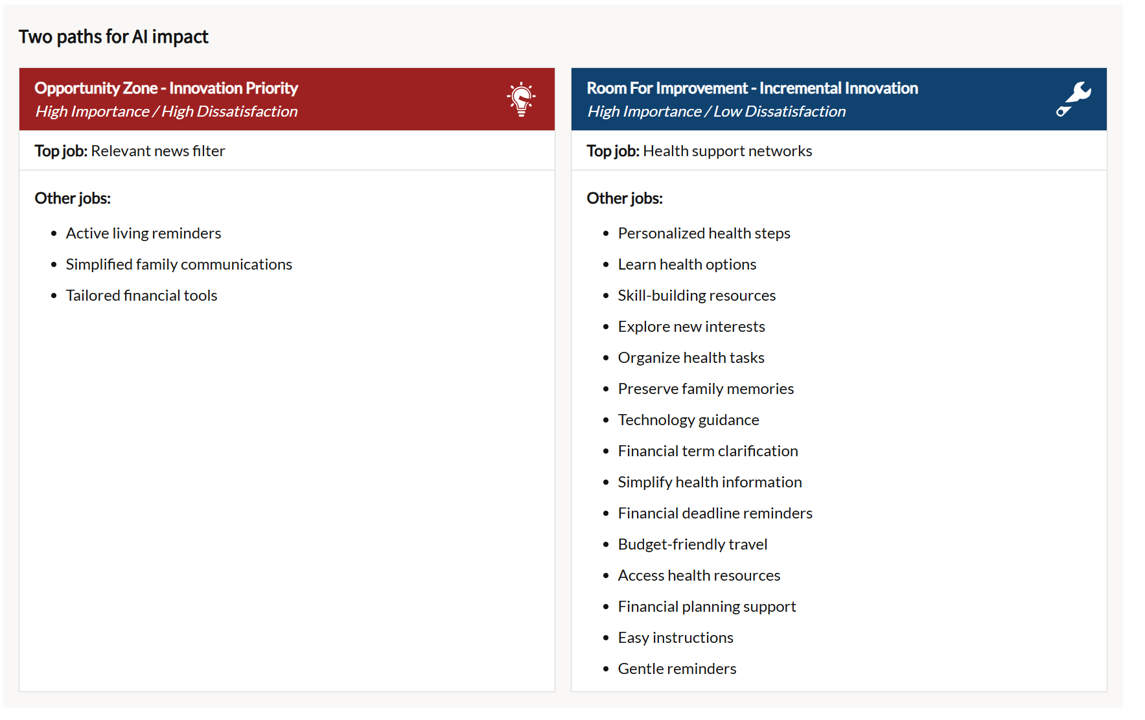 Health support is a highly-valued area (with many micro-“jobs” to do, as the chart details), with low dissatisfaction. Some jobs of value would be personalized health steps, learning health options, organizing health tasks (think: the many micro-tasks each day a personal managing diabetes must undertake), simplifying health information, and so on.
