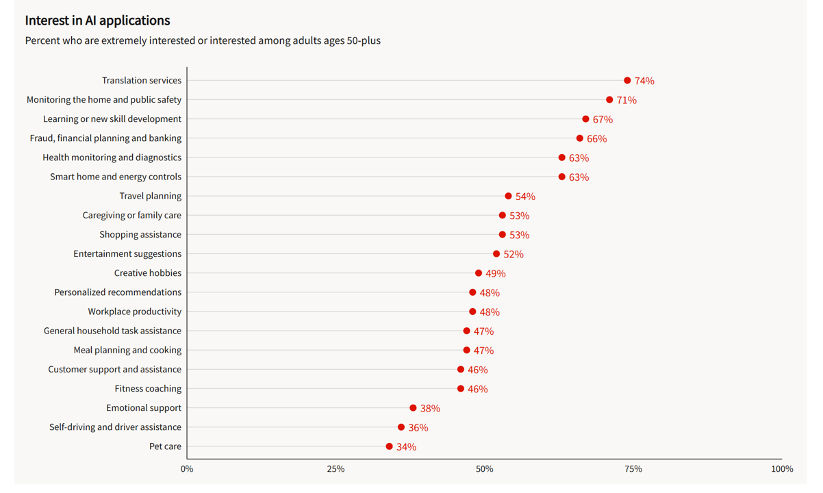There is great interest in using AI for a variety of applications, or “jobs” in the terms of this study: most enthusiasm was found for translation services (among 74% of older Americans), monitoring home and public safety (for 71%), learning new skills (67%), fraud/financial planning/banking (66%), health monitoring and diagnostics (63%), and smart home and energy controls (63%).