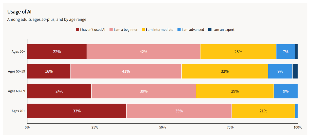 Topline, most people 50 and over have used AI in some way, with roughly 3 in 5 older Americans saying “I am a beginner” in using AI across age groups from 50 to 70+.