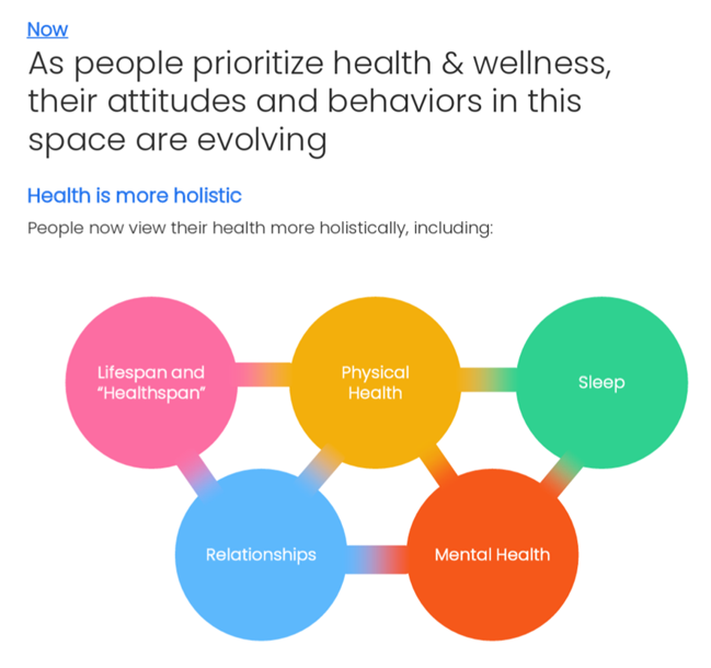 This first chart clipped from the report sets out how people are spending time at home, with wellness and convenience featuring top priorities for consumers — who are, we read in the Wellness pillar, are “being proactive about ways to help maintain, protect, and improve their health.”