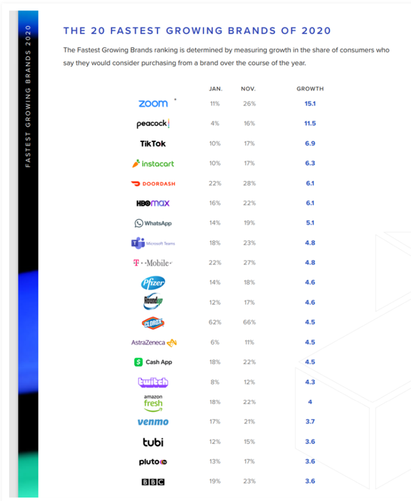 Note that Clorox ranked 12th fastest-growing — very impressive for a legacy brand. In 2020, Zoom ranked top as people working from home adopted the platform for virtual meetings and some for family connections). Also notable: Pfizer and AstraZeneca in the top 20 both of which was getting vaccines to the market as quickly as possible.