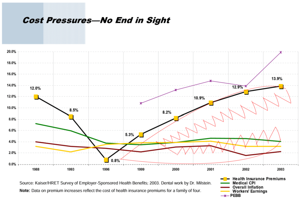 When I first saw this second chart in 2006, a few months before launching the Health Populi blog, I had seen Dr. Arnie Milstein, then leader of the Pacific Business Group on Health, speak about the “shark teeth” on the right side of the line graph which tracked the rise of workers’ wages with the rise of health care costs (embodied in health insurance premium costs) from 1988 to 2003. (Note Hill’s witty sourcing on the bottom of the chart noting “Dental work by Dr. Milstein”).