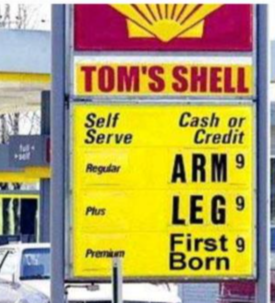 As consumers in the U.S. now face fast-rising gas prices in the context of trading off wages for health care, we find ourselves back in the world of Tom’s Shell petrol station who advertised the prices, cash or credit, as “ARM” for regular, “LEG” for plus, and “First Born” for premium petrol.