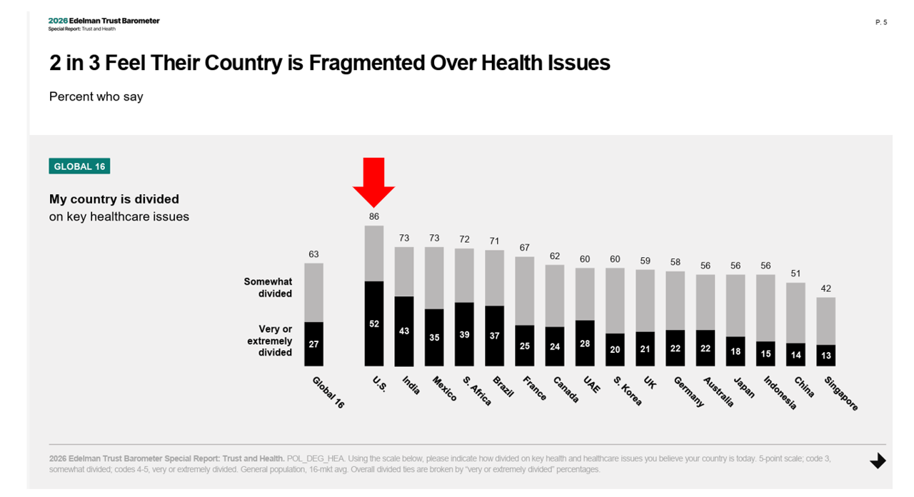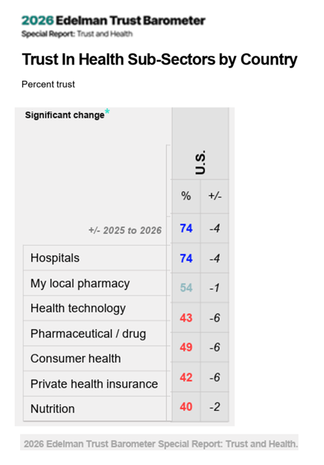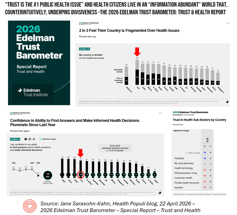 Following Edelman’s launch of the 2026 Edelman Trust Barometer in January at the World Economic Forum (covered here in Health Populi), the Edelman Trust Institute has followed up with a lens of health and trust, the report launching today with a live data-readout along with an informative and inspiring panel discussion with four global experts covering different aspects of the health care ecosystem.