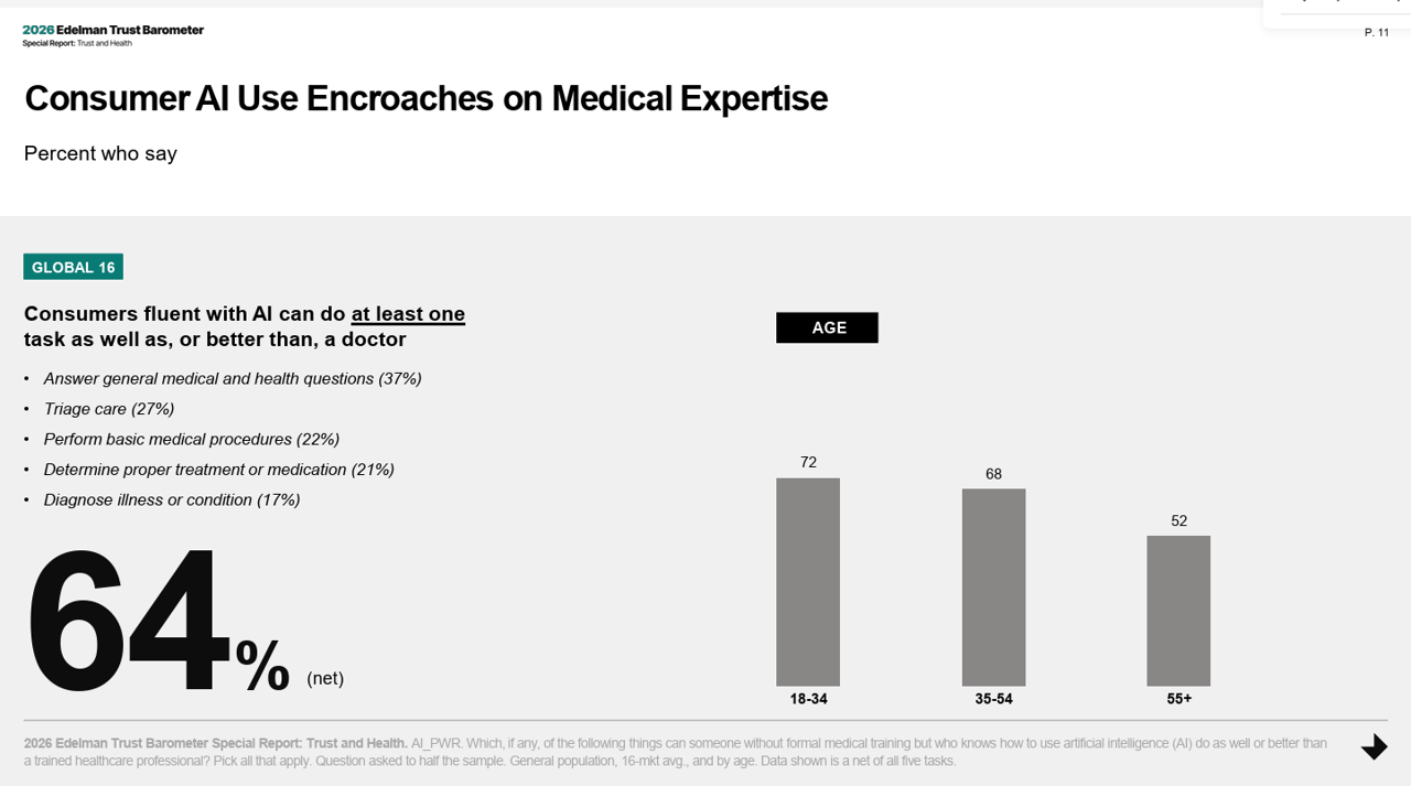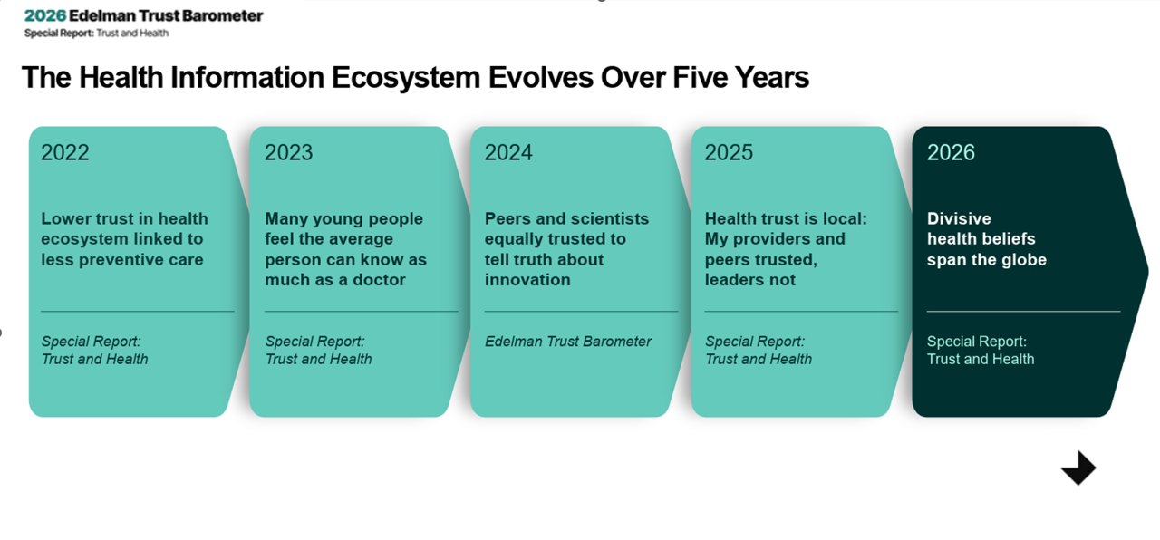 But it’s not such great news when we learn that said information abundance also underpins health citizens’ confidence in finding answers and making informed health decisions, we learn in the 2026 Edelman Trust Barometer’s Trust and Health edition.