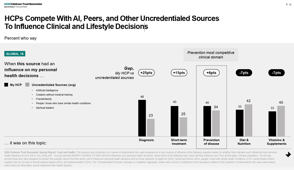 But there are surprising competitors for the health care provider (HCP) in Trust Town when it comes to information sources global citizens are looking to for information in that cornucopia of health info abundance: those are AI, peers, friends and family, and creators without medical training.