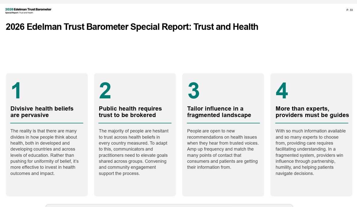 Among the Edelman team’s recommendations for calls-to-action to address the divisiveness, information abundance, and fast-growing role of AI as a convenient and immediate channel for accessing answers to personal health questions, these four points help to inform choices health-focused enterprises can make to help solve the information-trust crisis in health care.