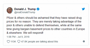 Trump prescription drug pricing rant on Twitter July 2018
