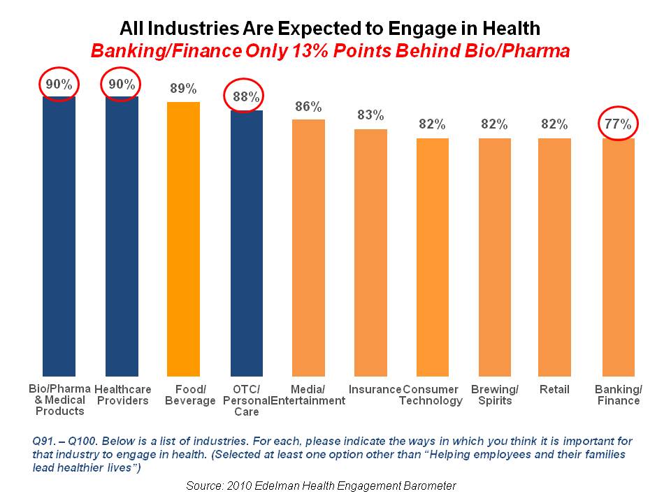 Look at the chart: while nearly all consumers believe that bio/pharma, health providers, and the over-the-counter (OTC) and personal care industry should engage in health beyond providing employee health benefits, 9 in 10 people think that food/beverage and media/entertainment businesses should engage in health beyond their “immediate family” of workers.