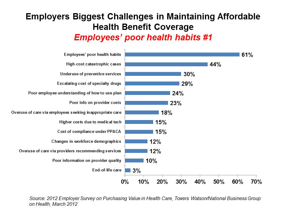 As the chart illustrates, employers #1 challenge for maintaining affordable health coverage is changing employee’s poor health habits. Employers ranked this challenge first last year, as well.