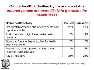 Overall, one-third of insured people go online to conduct various health tasks, compared with 26% of uninsured people who do so. The table illustrates that having health insurance has a positive influence on consumers’ online health information seeking — especially the social aspect of tracking other patients’ health experiences. 22% of insured adults read or watched someone else’s health experience online compared with only 17% of the uninsured. There’s also a gap between people using the Internet for conducting administrative tasks online, such as downloading forms or applying for health insurance (10% vs. 6%), and receiving email updates about health issues (9% compared to 6%).