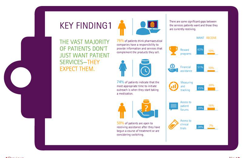 As the first picture shows, 70% of patients think pharma companies are responsible for bundling information and services around the products they market. 74% of patients are looking for those services as soon as they begin to take a medication, and half would be open to receiving assistance once they began taking the meds.