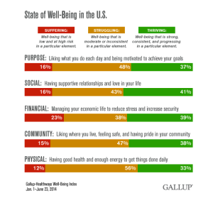 The last chart comes from the Gallup-Healthways Well-Being Index, measuring U.S. adults State of Well-Being for the first half of 2014. Note that 64% of people are struggling or suffering with respect to their sense of purpose (liking what they do each day and being motivated to achieve goals); 59% are struggling or suffering from poor social relationships; 61% aren’t thriving in their personal financial lives; 62% aren’t thriving in their community (with respect to safety, liking where they live, or having pride in their town); and 68% aren’t thriving in health.