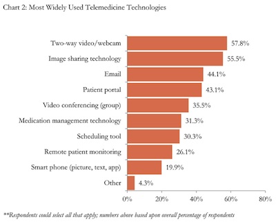 Currently, about 1 in 2 healthcare organizations use telemedicine tools, according to HIMSS Analytics 2014 Telemedicine Study released earlier this month. HIMSS surveyed 406 health providers and found that two-way video/webcam is the most prevalent telemedicine solution currently deployed in U.S. health care settings, closely followed by image sharing technology (like virtual PACS), email and patient portals.