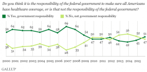 Why now? Check out the second chart, where the lines cross between “health care is a government responsibility” versus “health care is not government’s responsibility.” These lines crossed about eighteen months after the Recession hit Americans, then separated during economic improvement, and today…converge once again.