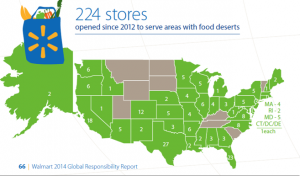 The third data point this week at the food/health nexus is Walmart, the nation’s largest grocery chain, which is opening a new “supercenter” in southern Cook County, Illinois – a food desert as determined by the U.S. Department of Agriculture. Food deserts are defined by the USDA as, “low-income census tracts where a significant number or share of residents is more than one mile … from the nearest supermarket.” In what is touted as the single largest retail development in the history of the Richton Park neighborhood, the store will feature fresh meats, produce, dairy, and other fresh foods. The store will also bolster the local economy with 340 jobs. This store opening comes five months after the company’s closure of 154 U.S. stores (Walmart press release here) which left several areas with food deserts, according to the Associated Press (those communities were cited by AP as Fairfield, AL; Coal Hill, AR; and, Wichita, KS).