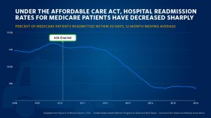 A second positive impact of the Affordable Care Act was the reduction of hospital readmission rates for Medicare patients. The second chart illustrates the dramatic decline in readmissions. This resulted from incentives (more accurately, dis-incentives) for hospitals to prevent older Americans from being readmitted into hospital inpatient beds within 30 days of being discharged for acute myocardial infarction (heart attack), chronic heart failure, and pneumonia.