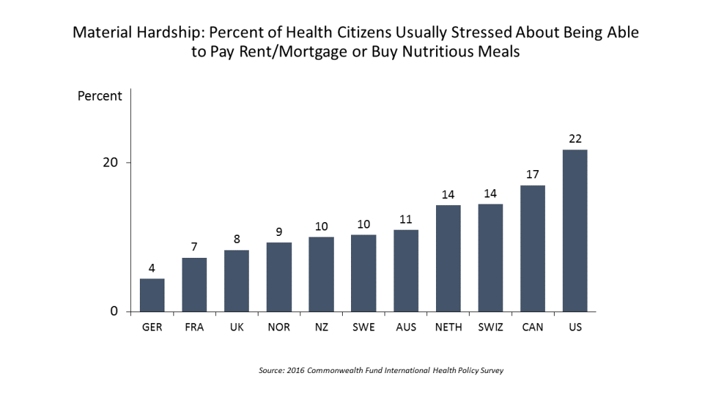 Look at the second chart, titled “Material Hardship.” This illustrates the social determinants of health aspects: that 1 in 5 U.S. adults has trouble paying the rent or mortgage, or affording nutritious food. Fewer health citizens in other wealthy nations are challenged in this way: Canada is second in line to the U.S., with 17% of Canadians stressed about paying for housing or healthy food.