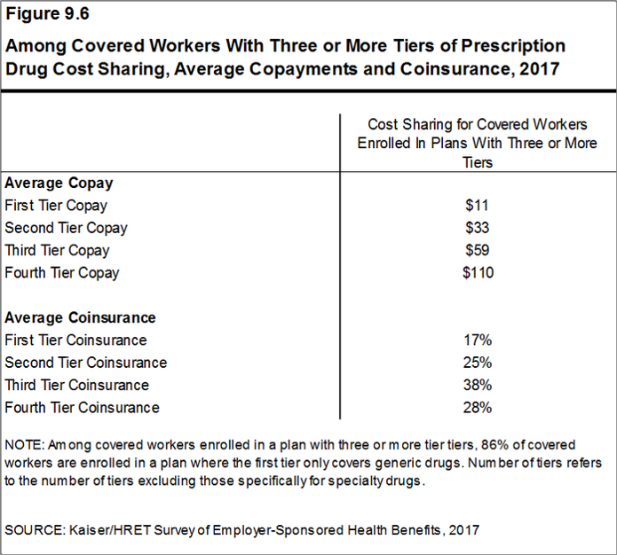 83% of covered workers’ plans have three or more tiers for consumers’ cost-sharing. Co-payments are the most common form of cost sharing in the first three tiers, shown in the second chart. Coinsurance is the second type of cost-sharing for Rx drugs.