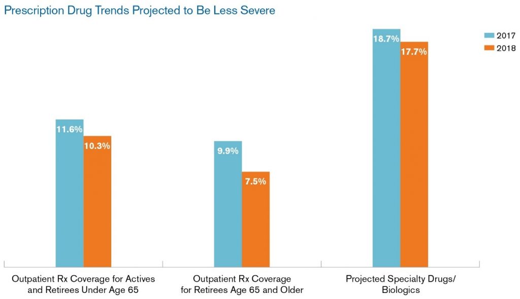 Specialty drug costs will rise nearly 18% in 2018, according to the Segal Company’s annual health plan survey, shown in the bar chart. With such a forecast, employees covered by prescription drug plans can expect to face growing complexity and shared costs in 2018 and beyond if regulatory and legislative forces don’t directly address this dynamic.