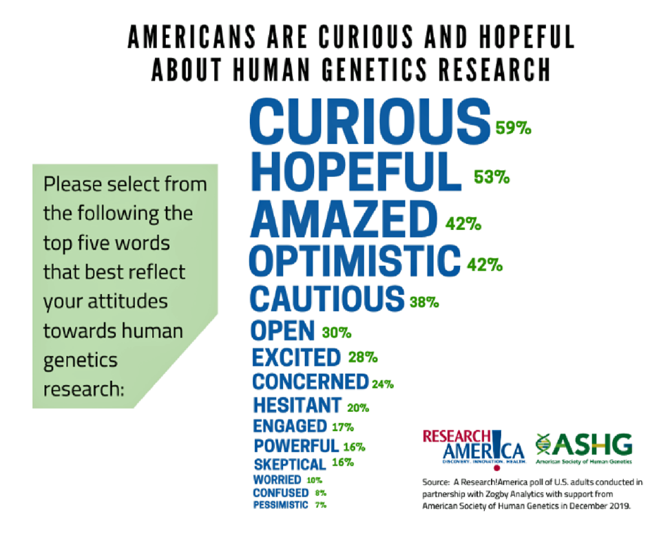 Most Americans associate more optimistic words with human genetics research than they do darker implications: “curious,” “hopeful,” “amazed.” and indeed “optimistic” ranked the top four impressions in peoples’ minds, based on a survey form the American Society of Human Genetics (ASHG).