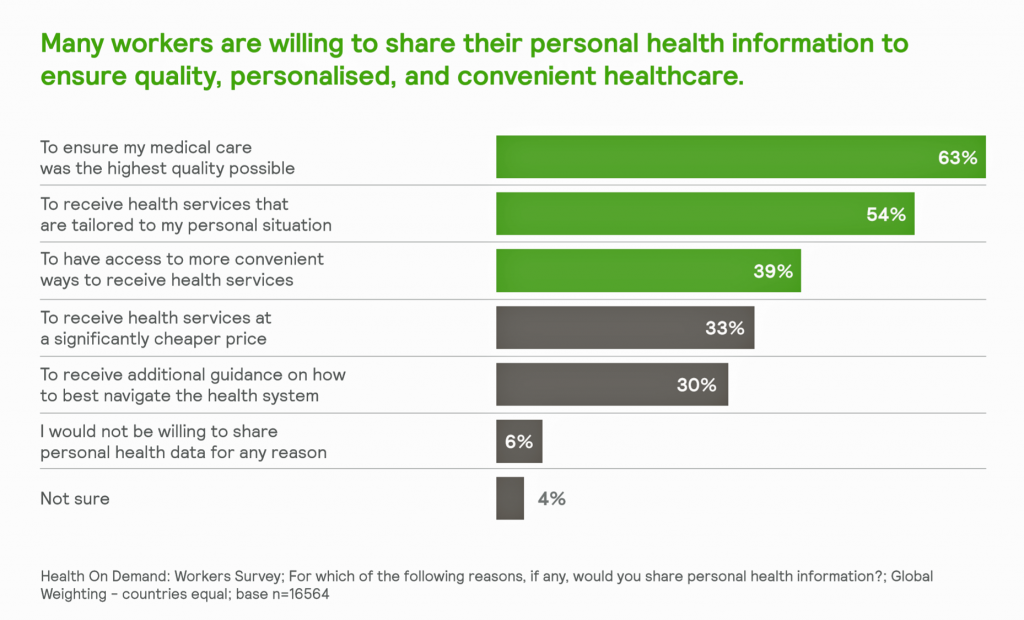 To that end, most workers would be willing to share their personal health information to ensure high quality care and receive customized services. Four in ten people would also trade health information to access more convenient care. Thus, the value-exchange between a patient/consumer and her data could cover quality, personalization and access. Only 6% of workers in this survey said they would not be willing to share their PHI for any reason.