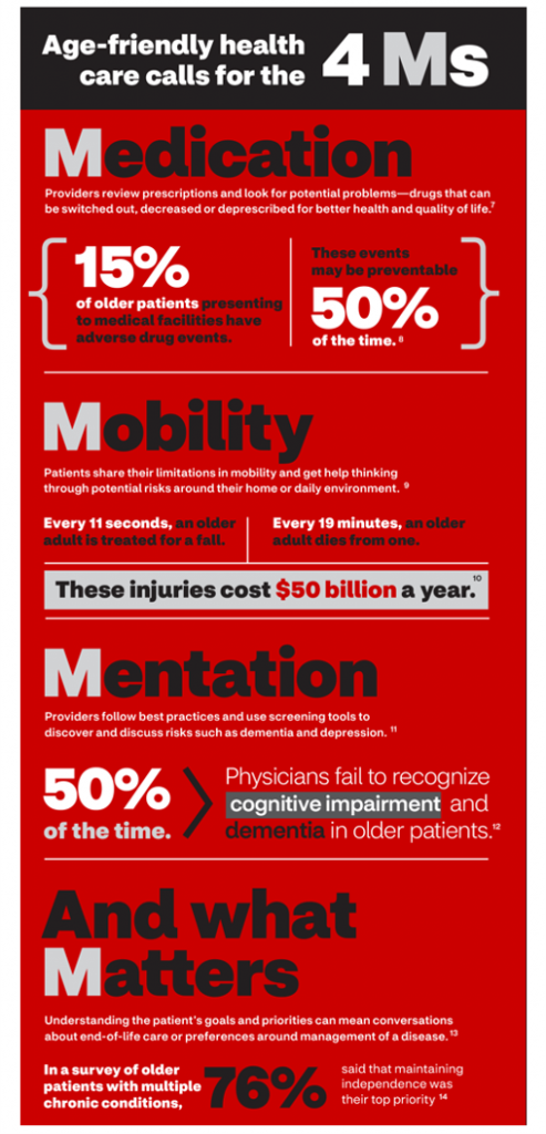The bold red graphic above comes from the CVS Health report, calling out “4 M’s” that can improve health and care for older people.